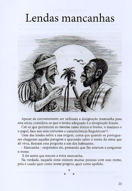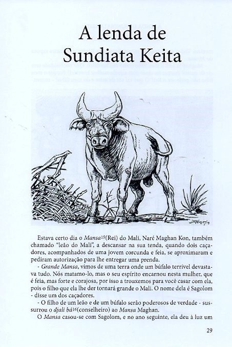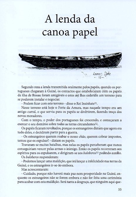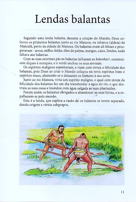 · Lendas balantas - a origem dos balantas e o porco que deu nome ao conhecido Presidente Kumba Yalá; · Lendas bijagós - a origem dos bijagós, as suas lutas, as suas "rainhas", e o tesouro de Oquinca Pampa; · Lendas mancanhas - a origens dos mancanhos, e a bela história de amor que deu origem à localidade de Bula; · A Lenda de Sundiata Keita - é a lenda de uma das maiores epopeias africanas, a história do menino que não conseguia andar, que aos 10 anos foi obrigado a fugir para não ser morto, e que a partir do nada, apenas com a sua determinação, coragem e inteligência, criou o maior império africano; · A lenda de Djanqui Uali - Djanki Uali o último imperador do Império de Cabú, e a heróica batalha pela defesa da sua capital, Cansalá (sedeada na atual Guiné-Bissau), tornaram-se um símbolo de coragem, pois com 600 guerreiros destruiu um exército de 40.000; · A lenda de Alfa Môlo - Alfa Môlo era um pobre servo ao serviço de uma família rica, que liderou a revolta no Reino do Firdu, um Reino em que os servos e os escravos, passaram a ser os novos senhores, e ele o seu novo rei; · A lenda da canoa papel - a luta dos papéis de Bissau contra os estrangeiros, e a sua canoa com espíritos malignos que desapareceu.