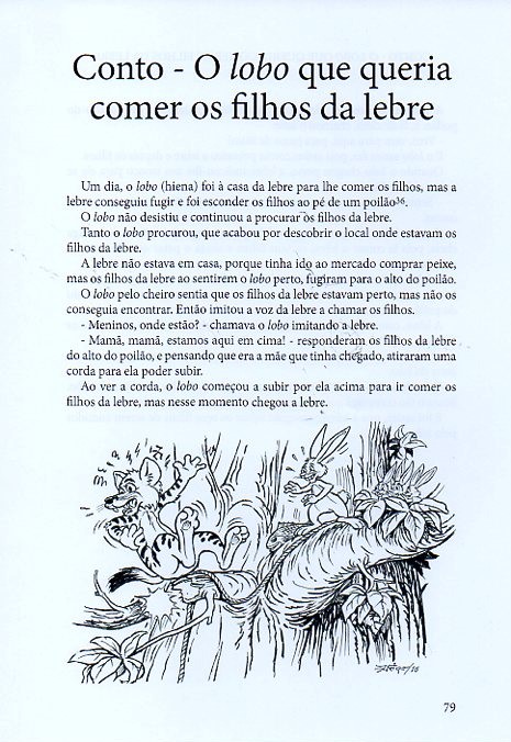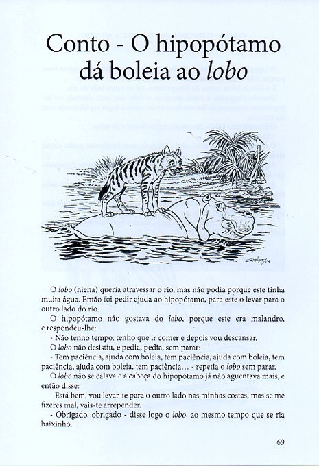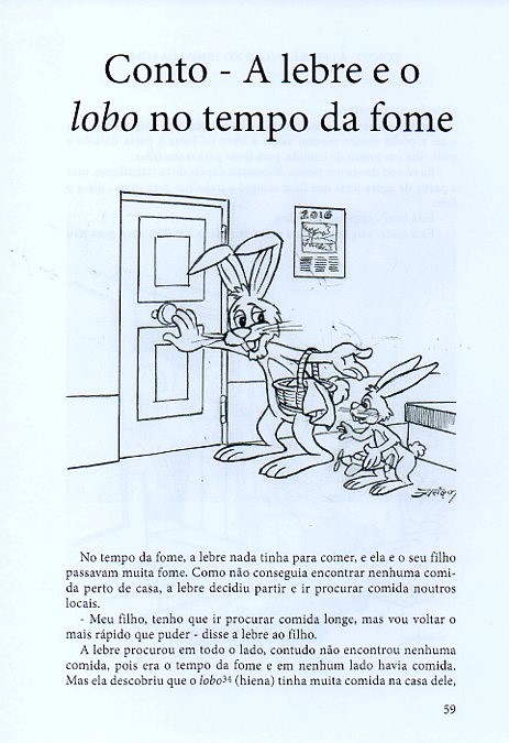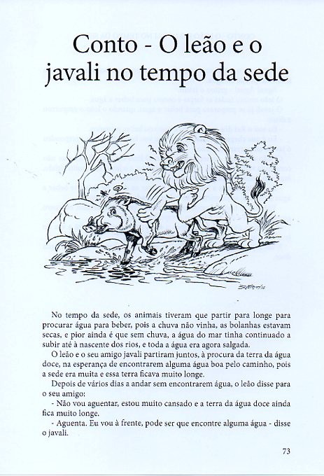 Os seguintes contos narram como a esperteza da lebre e do camaleão, que conseguem vencer o maldoso lobo em desafios impossíveis. Os contos lembram ainda os perigos que correm as crianças sozinhas no mato, a importância da paz, da unidade, da amizade e da solidariedade: · A lebre e o lobo no tempo da fome; · O camaleão ganha a corrida ao lobo; · O casamento do lebrão; · O hipopótamo dá boleia ao lobo; · O leão e o javali no tempo da sede; · O lobo e a lebre vão à pesca; · O lobo que queria comer os filhos da lebre. · O menino e o patu-feron.